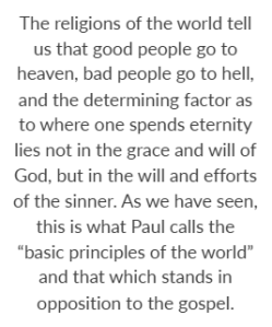 In historic Protestant theology, the three great enemies facing the Christian are the world, the flesh and the devil. The world is understood to be those material enticements which draw us away from Christ and his kingdom—fame, fortune, and as Francis Schaeffer calls it— “personal peace and affluency.” In this case, it is identifying with this present evil age which is passing away and from which Christ came to rescue us (Galatians 1:4). Following the way of the world would be akin to having no interest in thinking like a Christian about the issues of life, and intellectually identifying with the world in opposition to the Law and gospel. The religions of the world tell us that good people go to heaven, bad people go to hell, and the determining factor as to where one spends eternity lies not in the grace and will of God, but in the will and efforts of the sinner. As we have seen, this is what Paul calls the “basic principles of the world” and that which stands in opposition to the gospel.